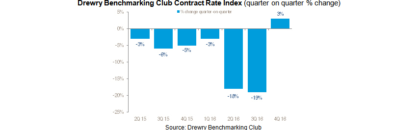 London, UK, 14th December 2016 – Ocean freight rates for cargo moving under contracts on the major East-West trade routes saw a reversal of trend in 4Q 2016, according to Drewry’s Benchmarking Club, a closed user group of 50 multinational retailers and manufacturers who closely monitor their contract freight rates.