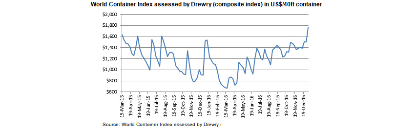 London, UK, 5 January 2017 – Spot container freight rates on the major East-West routes reached a 20-month high this week and have risen above the average of the last 5 years.