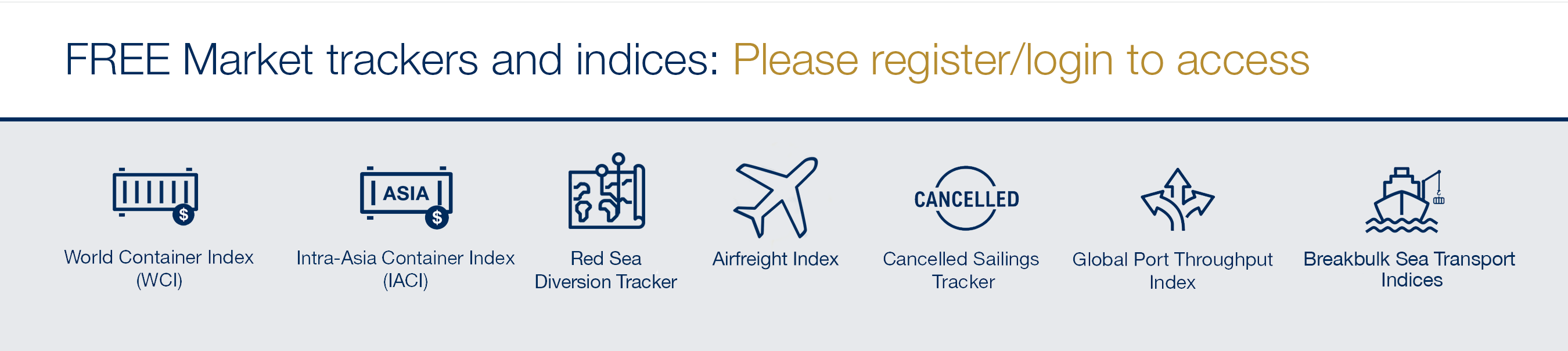 Access FREE market indices and trackers, from our weekly World Container Index and Cancelled Sailings Tracker to fortnightly Intra-Asia Container Index, monthly Breakbulk Sea Transport and Port Throughput Indices. Combined, these indices provide useful reference points to help track market development. Please take a moment to Register or Login